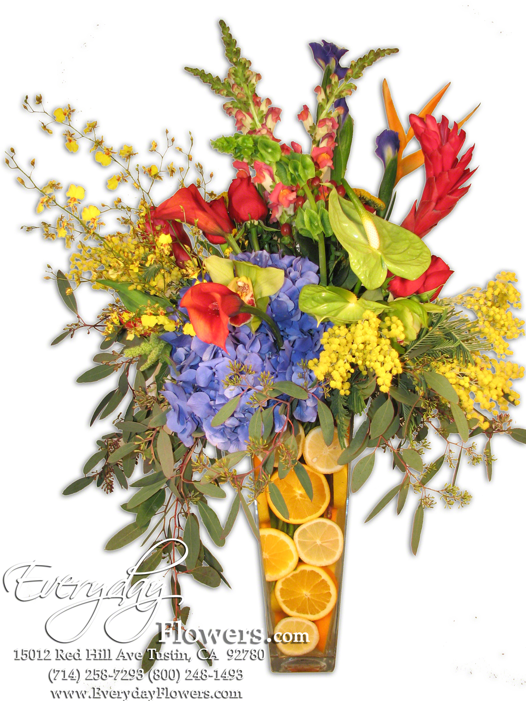 This arrangement features cut oranges placed against the inside of the Glass Vase. The flowers include a mix of tropical flowers Green Anthuriums, Orange Parakeet (Helconia) Green Cymbidium Orchids Yellow Oncidium Orchids also red Calla Lilies Bells of Ireland Snap Dragons Iris Red Roses Blue Hydrangea and Yellow Acacia.